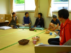 The very first socializing event at the ‘Kyu-Ohara Junior High School Atochi’ transitional shelter compound in Oshika Peninsula will be on the 21st of August. This compound consists of 29 households originally from three communities where some emotional tension was observed among the members because one community was prioritized in early move-in over others due to a community member’s involvement in the city government. 14 residents, mainly elderly women gathered and enjoyed chatting, singing and dancing. They have been at the transitional shelters since the end of June, and this was the very first meeting held open for women. There was a strong request for more events like that or with activities which may lead to livelihood assistance.